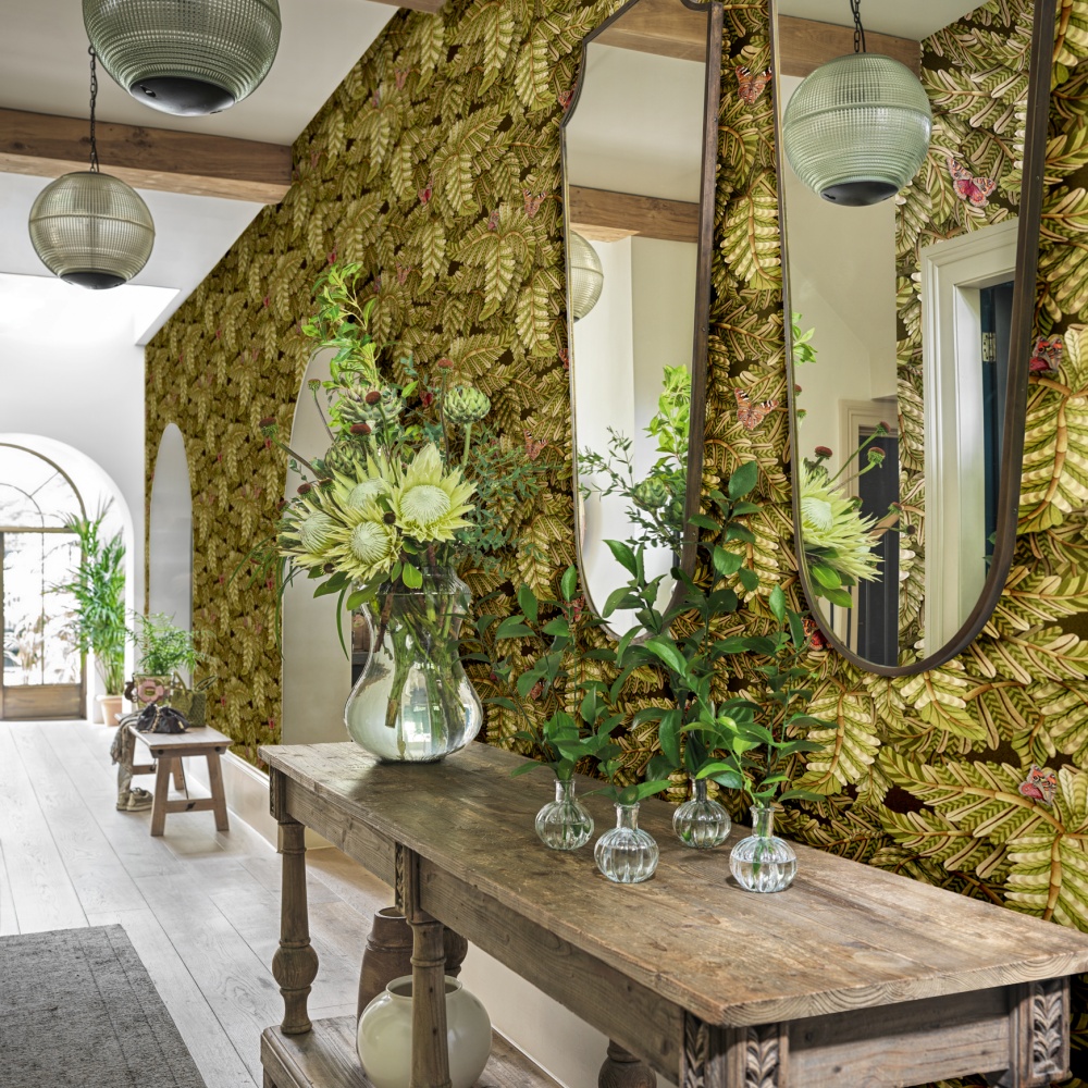 Dicht bladerdak met vlinders, handgeschilderde details en luxe natuurlijke tinten.