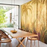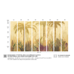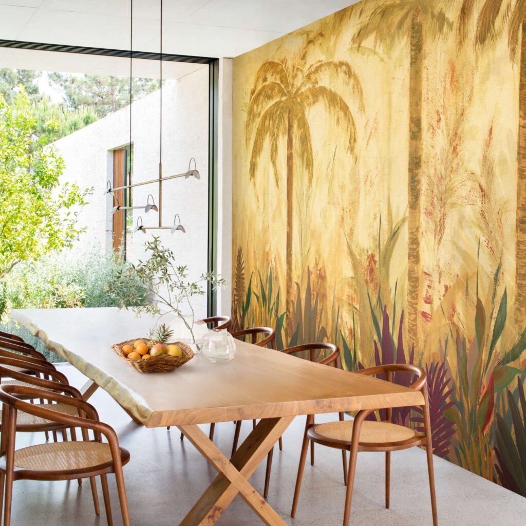 Een wandvullende muurbekleding van een landschap met palmbomen.