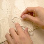Luxe linnen panorama behang met een handgeborduurde Japanse boom.