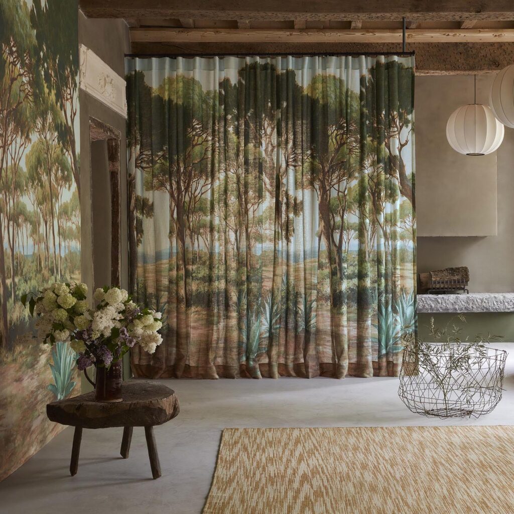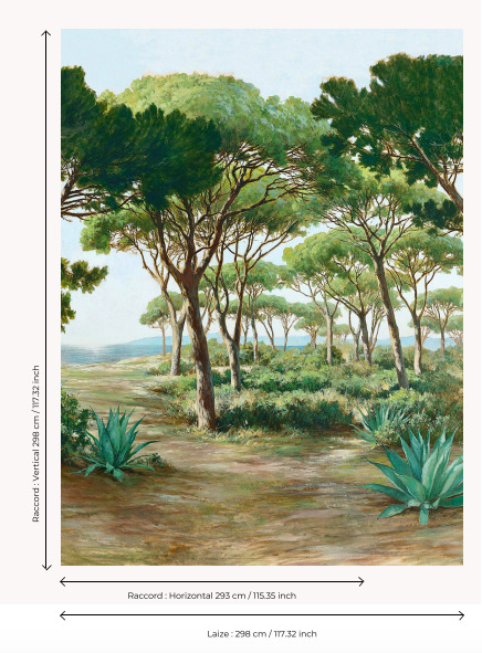 De stof L'Esterel is een stof uit de Panoramiques collectie van Pierre Frey. Het ontwerp toont een idyllisch Zuid Frans landschap met parasol dennen en prachtig getekende Algave bomen. Het ontwerp is zo intens en geeft een prachtige sfeer. Het doorlopende panorama patroon heeft een hoogte van 300 cm en is gedrukt op een linnen van exceptionele kwaliteit.- Stof paneel: 298 cm hoog x 298 cm breed