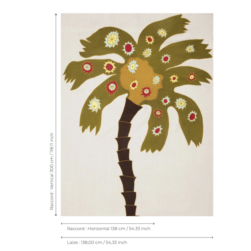 Het stofpaneel Les Palmes d’Alma is een indrukwekkend ontwerp van 138 cm breed en 300 cm hoog. Als in een droom rijst een majestueuze palmboom omhoog, subtiel versierd met fonkelende sterren en uitgevoerd in het meest verfijnde borduurwerk. Dit volledig op linnen geborduurde paneel straalt luxe, zachtheid en elegantie uit en vormt een echte blikvanger in elk interieur. Dit 3 meter hoge paneel vormt een perfect duo met referentie F3564001 LES PALMES D’ALMA II Nuit. Samen creëren ze een harmonieus en artistiek geheel met een bijzondere uitstraling. Een bijzonder ontwerp met een verhaal Het ontwerp is gemaakt door de 11-jarige Alma. Met haar creatieve visie bracht zij een poëtische palmboom tot leven. Bovendien draagt deze stof bij aan een mooi doel: 10% van de winst wordt gedoneerd aan de Fondation de France ter ondersteuning van het project Tous unis contre le virus. Dit initiatief zet zich in om schooluitval onder kinderen tegen te gaan.- Handgemaakt borduurwerk